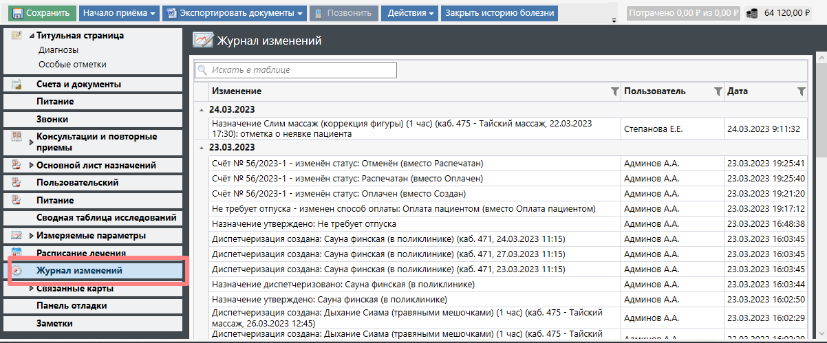 При наличии специального права в разделе могут также отображаться начатые, но еще не завершенные приемы.