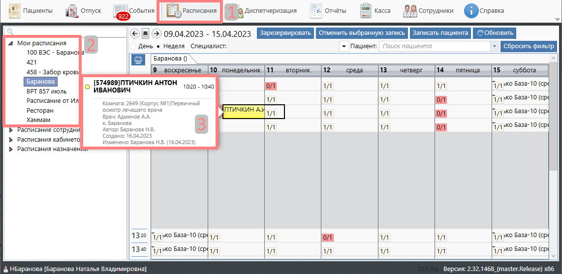2. На экране есть секция всех расписаний, в т.ч. врача, который в данный момент авторизован. Его расписания расположены в секции меню «Мои расписания» (2).