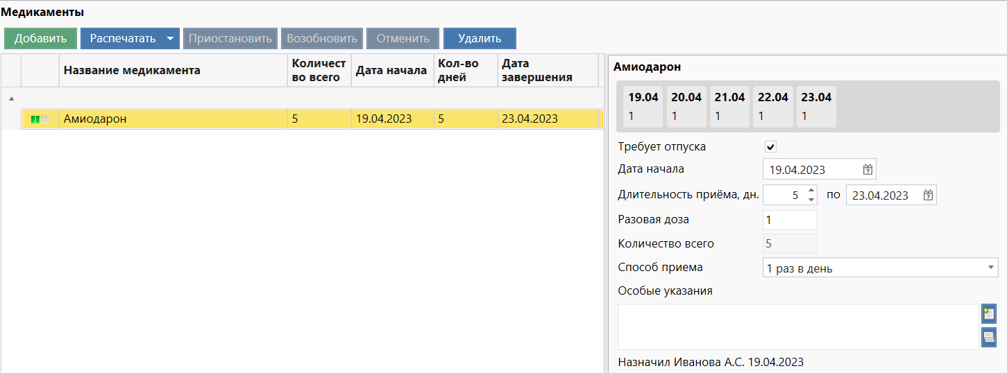 8. После добавления медикамента, необходимо заполнить параметры назначения.