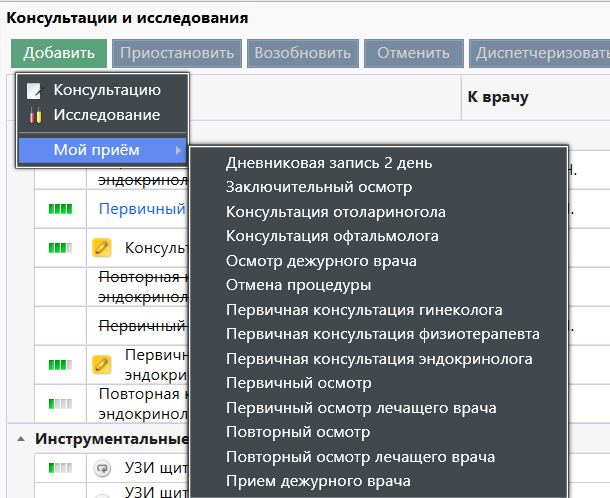 5. Лечащий врач может назначать консультации или исследования (5)Добавляются консультации и исследования аналогичным способом, как из лечебной программы. В секции «Мой прием», для удобства, расположены те консультации и исследования, которые вы можете провести.