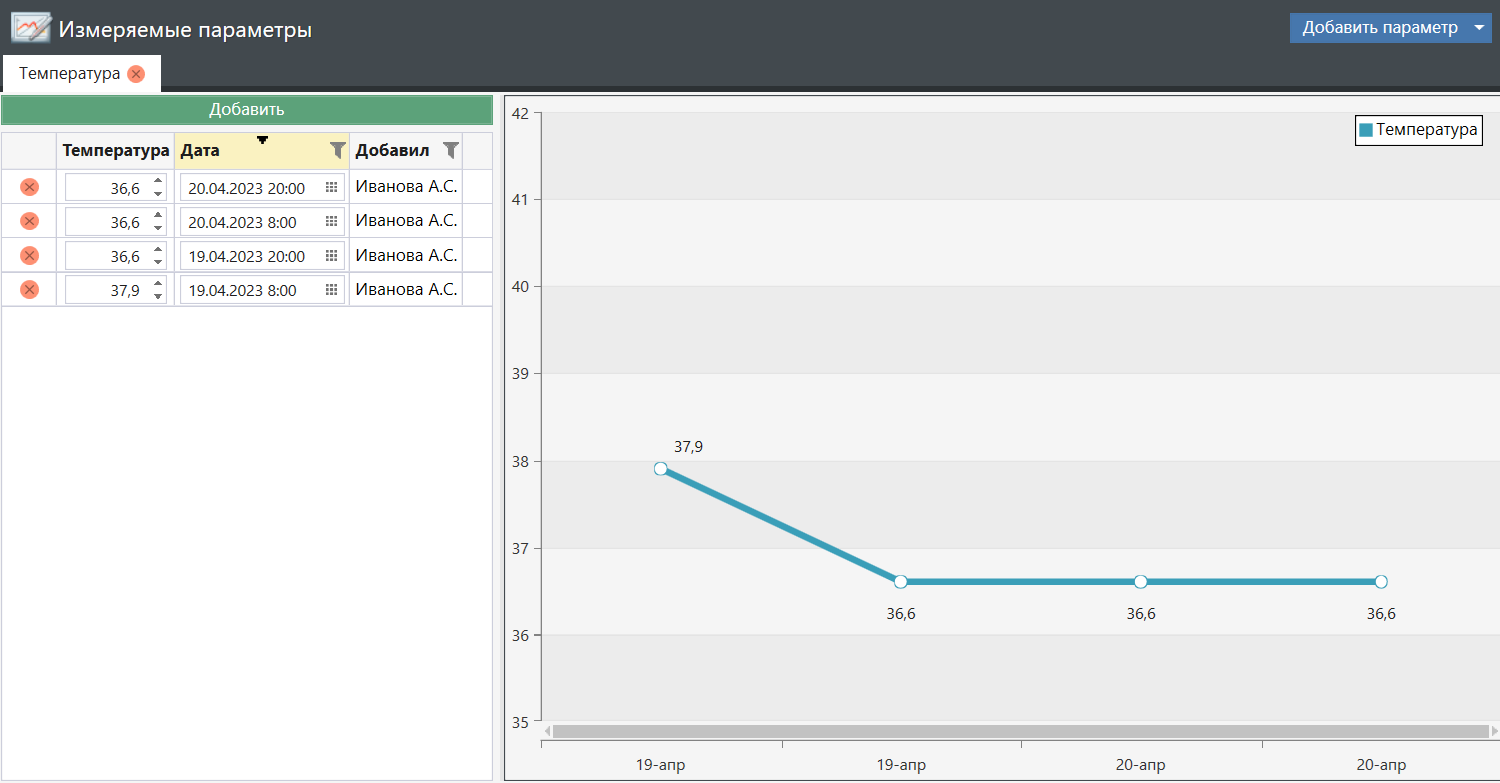 • Заполнять данные по измеряемым параметрам (давление, температура, вес и т.д.).