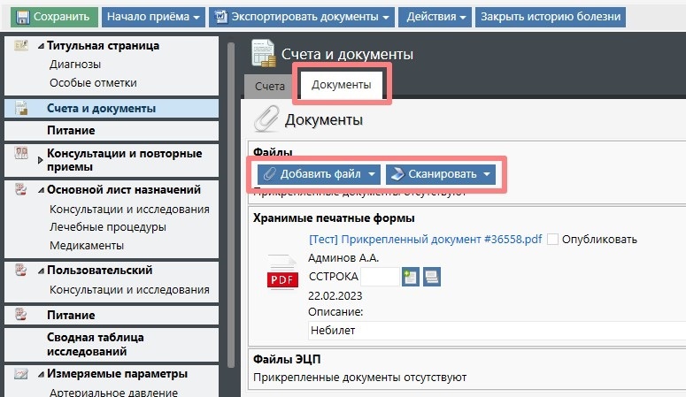 9. На вкладке "Документы" можно прикреплять электронные файлы или сканировать документы.
