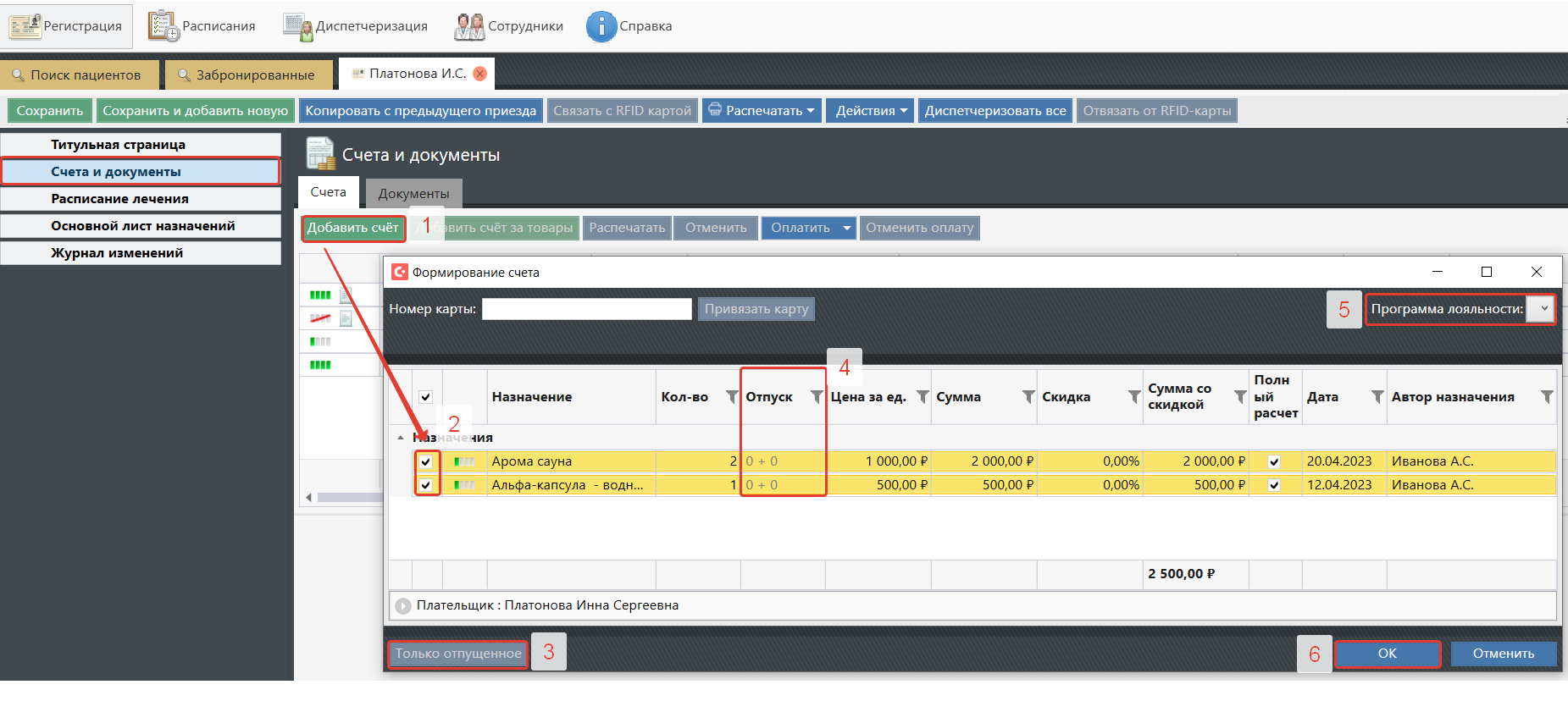 5. Если у пациента скидка, то следует ее выбрать в меню «Программа лояльности» (5). Так же можно выставить скидку вручную в колонке «Скидка».