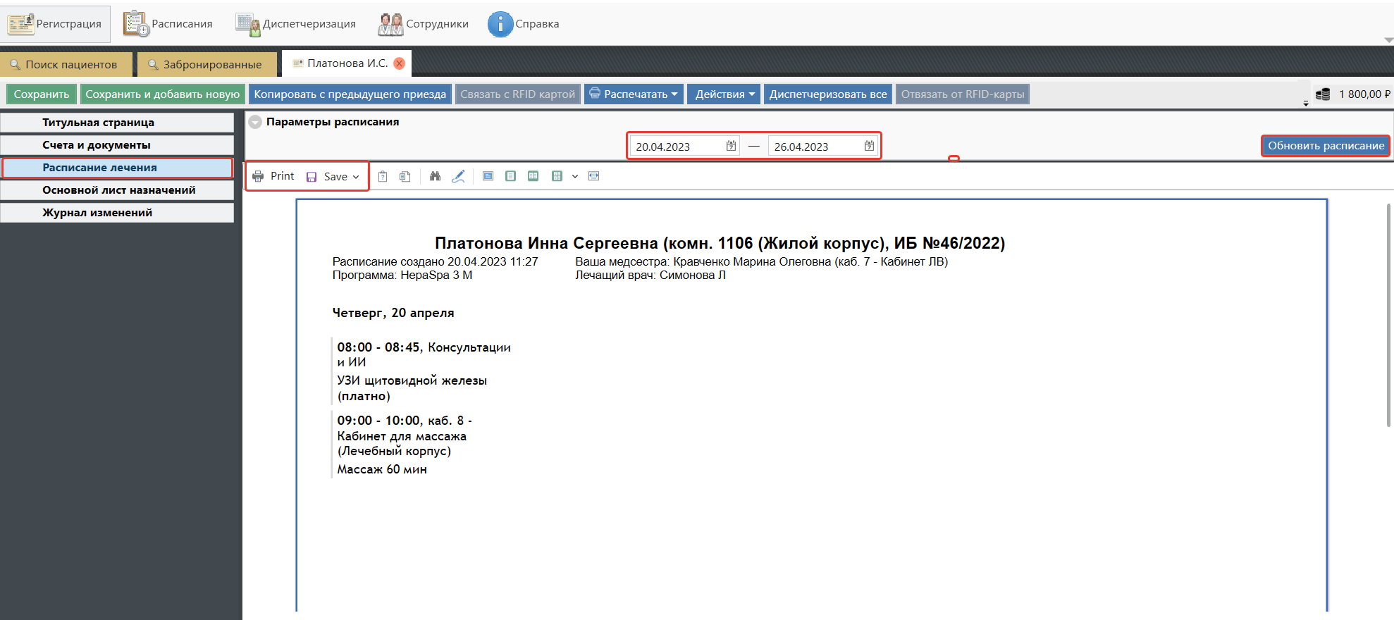На вкладке «Расписание лечения» формируется печатная форма расписания пациента со всеми назначениями в виде удобной таблицы.