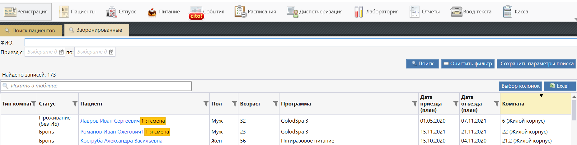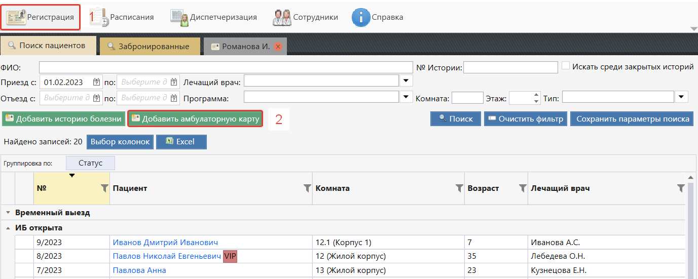 - "Забронированные" - вкладка используется если настроена интеграция с системой размещения. На ней отображаются карты еще не заехавших пациентов в статусе "Бронь" и "Проживание без ИБ". С этой вкладки из Брони открываются ИБ.