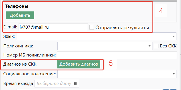- Есть возможность добавить "Лечебные программы" (2), указать "Программу лояльности" (3), добавить контактные данные (4) и "Диагноз из СКК" (5).
