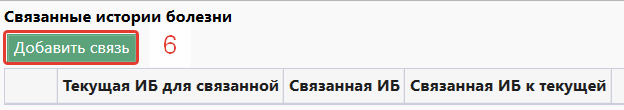 - Внизу титульной страницы есть возможность установить связь по счетам (6), указывая кто для данной карты будет Плательщиком. После нажатия на кнопку "Добавить связь" выбираем ИБ, с которой требуется связать открытую и нажимаем кнопку "ОК". В поле "Текущая ИБ для связанной" указывается роль самого человека, история болезни которого открыта в данный момент. В полях "Связанная ИБ" и "Связанная ИБ к текущей" указываются связанные истории болезней и соответствующие роли для них.