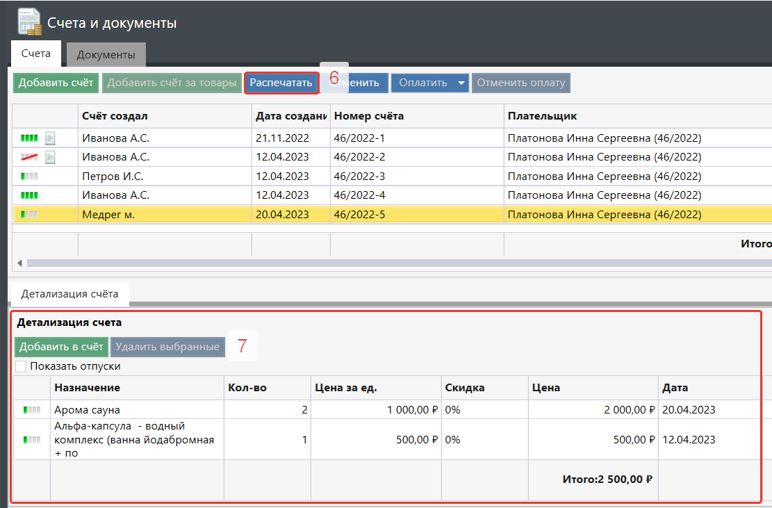 После печати статус счета станет . Есть возможность редактировать созданный счет: кнопки "Добавить в счет" (6) и "Удалить выбранные" будут доступны только пользователю, который этот счет создал и только первые 15 минут после создания. На вкладке "Документы" можно прикреплять электронные файлы или сканировать документы.