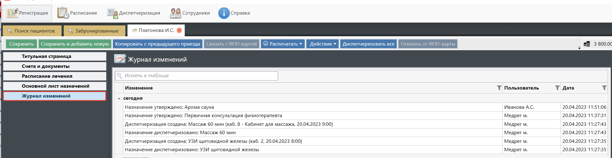 - В Журнал изменений выводится вся история изменений диспетчеризаций: отмена, изменение времени, перенос.