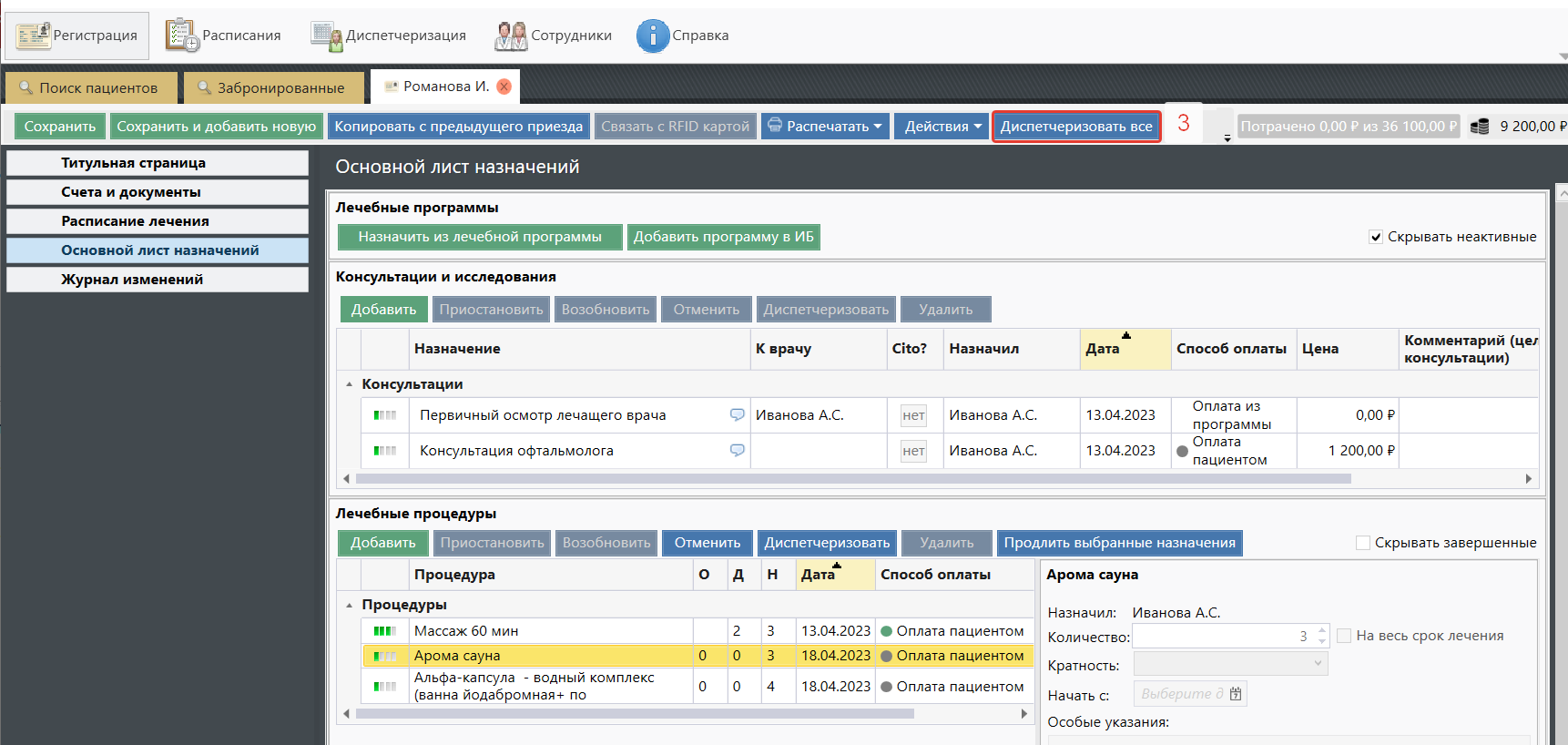 Лист назначений состоит из нескольких секций: "Лечебные программы", "Консультации и исследования", "Лечебные процедуры", "Медикаменты".