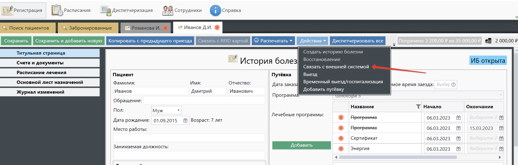 1.2 Система проверит заполнение всех обязательных полей, а именно: Фамилия, Имя, Пол, Дата рождения, Санаторная программа, Срок лечения по путёвке, Лечащий врач, Медсестра, Комната. После проверки карта поменяет статус на "ИБ открыта" и будет присвоен номер ИБ. Так как информация по Брони приходит из внешней системы, то обычно персональные данные уже заполнены. Важно понимать, что данные из внешней системы приоритетней, и если будут внесены изменения во внешней системе - то они будут синхронизированы.
