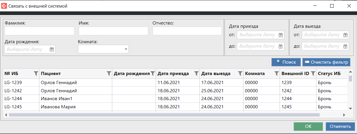 - Откроется окно с выбором предыдущего заезда, где можно найти прежние ИБ по ФИО пациента или дате его рождения.