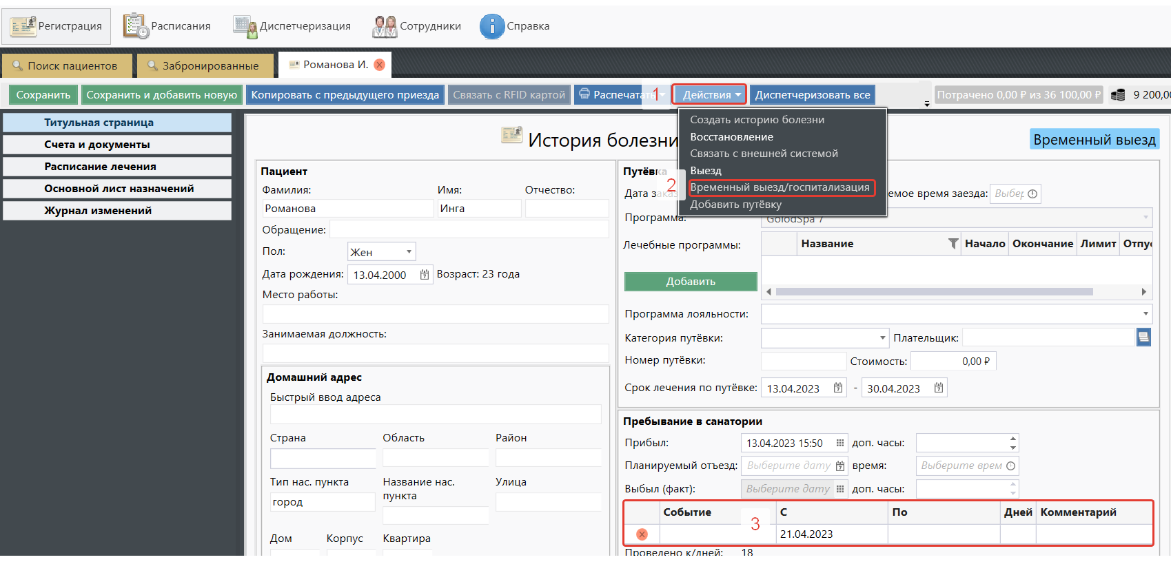 Данная функция необходима в случае, если пациенту требуется временно покинуть санаторий по личным причинам или в случае госпитализации.