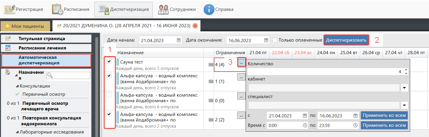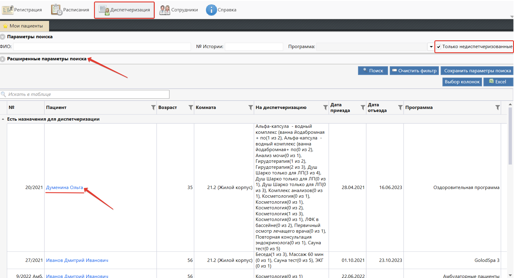 - Для того, чтобы отображались только те пациенты, у которых есть недиспетчеризованные назначение следует поставить галочку «Только недиспетчеризованные».