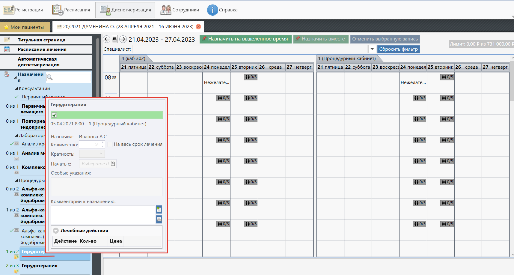 - В модуле «Расписания» выбрать соответствующее назначение или кабинет, выбрать ячейку с необходимым временем и процедурой, и нажать кнопку «Записать пациента».