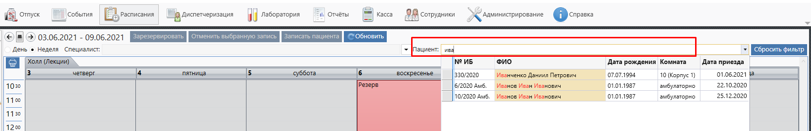 Есть возможность вывести расписание пациента, для это необходимо в фильтр «Пациент» ввести ФИО. Выводятся все амбулаторные карты и ИБ, у которых срок выезда >= текущей дате: