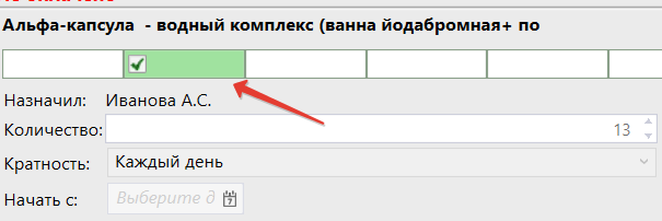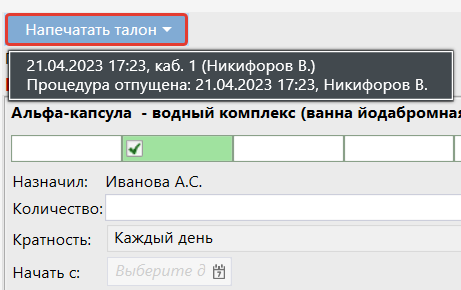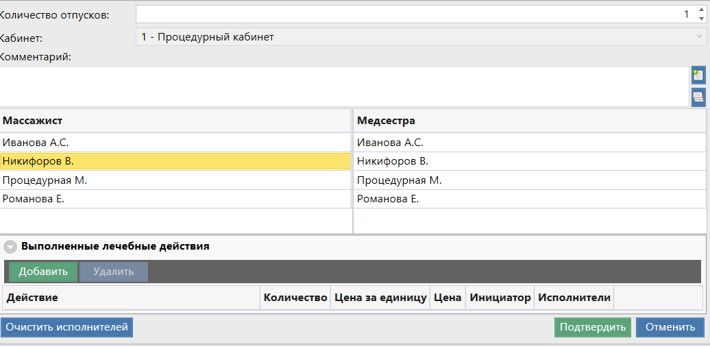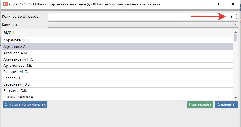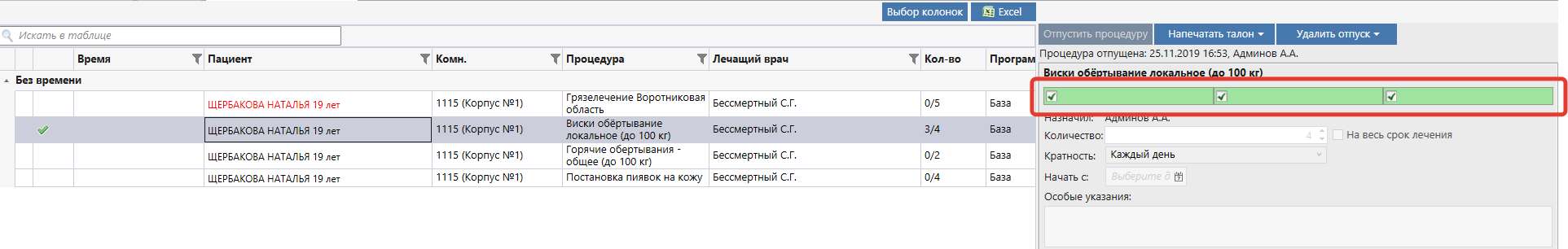 После нажатия кнопки "Подтвердить" для пациента будут отмечены выполненными столько процедур, сколько было указано в поле "Количество отпусков".