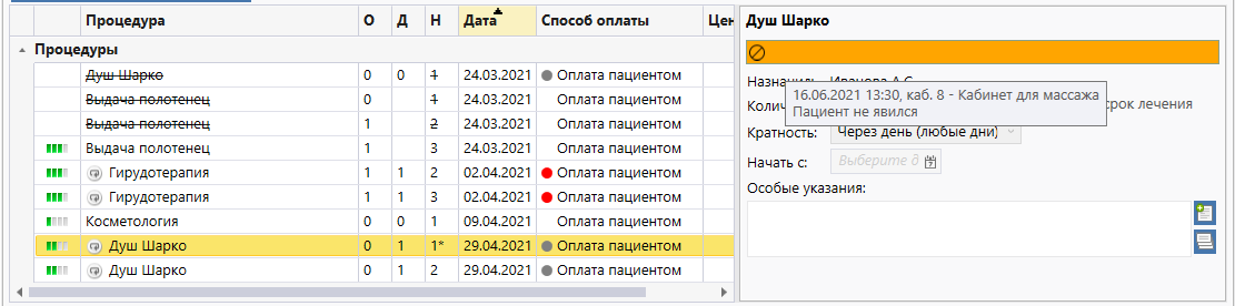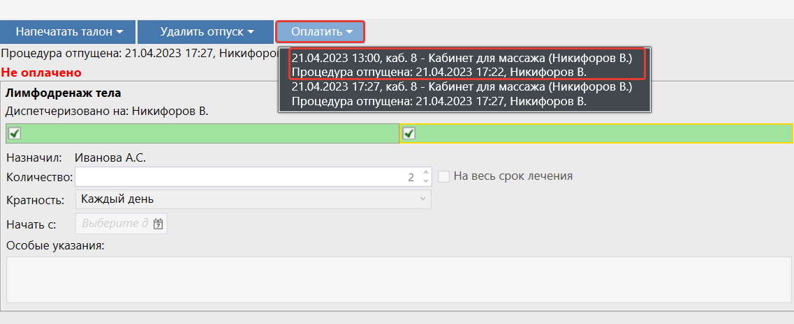 Обратите внимание, что в случае, если процедура не оплачена, то имя пациента будет подсвечено красным цветом, а в секции процедуры будет стоять статус «Не оплачено».