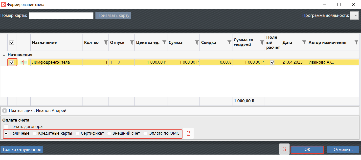 По нажатию кнопки "Оплатить" откроется список отпущенных услуг. Выбираем необходимую, далее откроется окно "Формирование счета", в котором мы выбираем галочкой услугу (1) выбираем платежный инструмент (2) и нажимаем "ОК" (3).