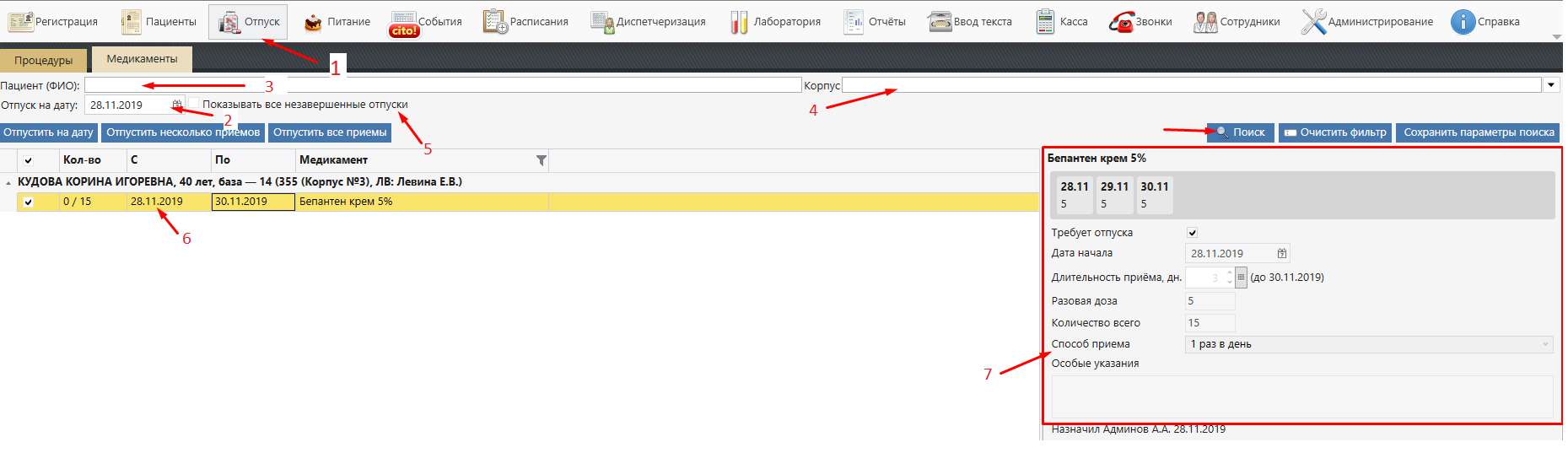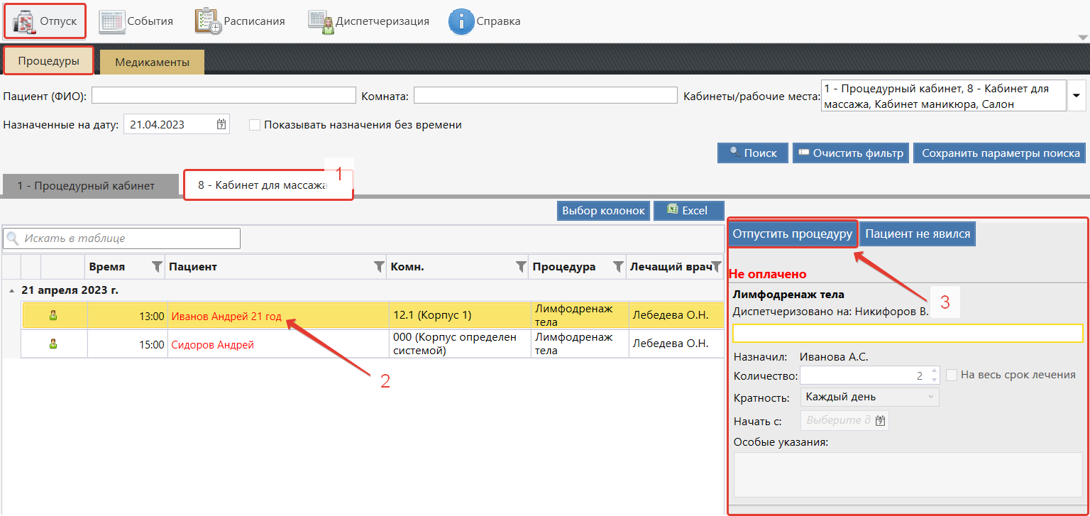 6. Для отпуска нажмите кнопку "Отпустить процедуру" (3). В случае если процедура не фиксированной длительности, либо нужно отмечать время начала и время окончания процедуры, то будут активны кнопки «Начать отпуск» и «Завершить процедуру». В остальных случаях будет активна кнопка «Отпустить процедуру».