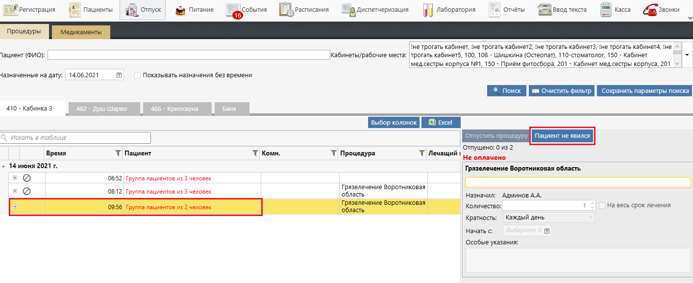 В модуле "Отпуск" реализована возможность проставлять отметку неявки пациента на назначенные процедуры с помощью кнопки "Пациент не явился".