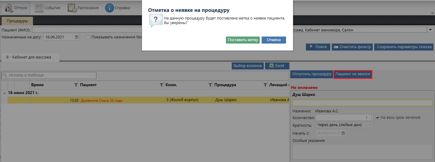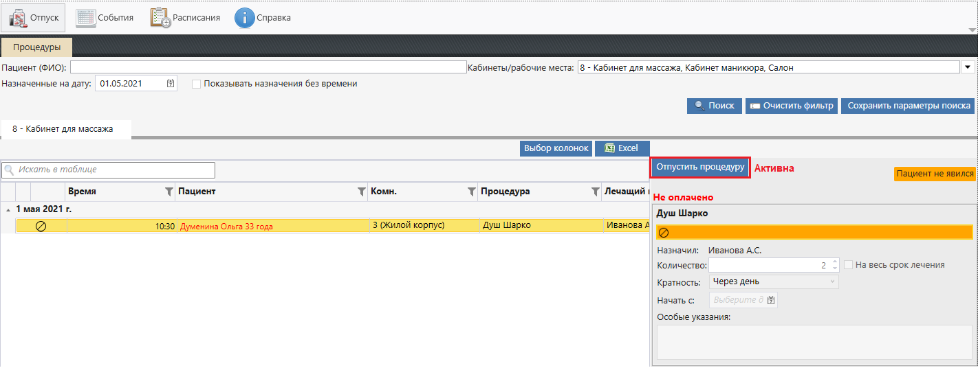 Если пациент придет позже, то несмотря на наличие метки "пациент не явился" процедуру можно будет отпустить (отметка будет заменена на "отпущен"), кнопка "Отпустить процедуру" активна: