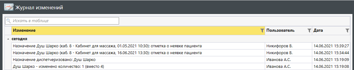В "Журнале изменений" добавляется запись о пользователе, который проставил отметку о неявке пациента: