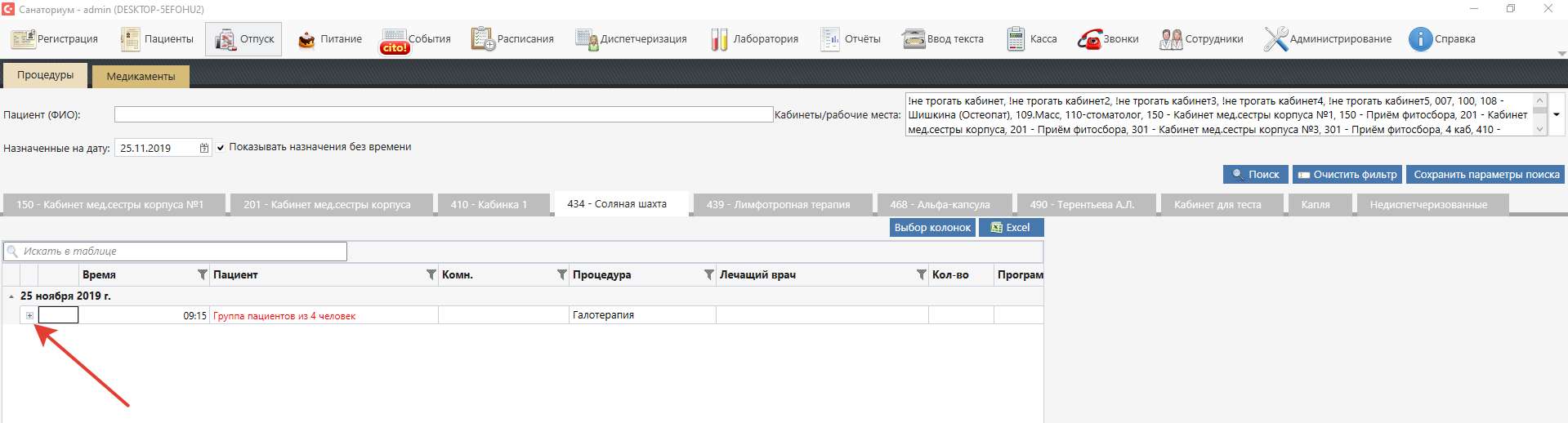 1. Если в окне отпуска Вы видите знак +, значит на данное время назначена либо группа людей на одну процедуру, либо для пациента назначено несколько услуг на данное время: