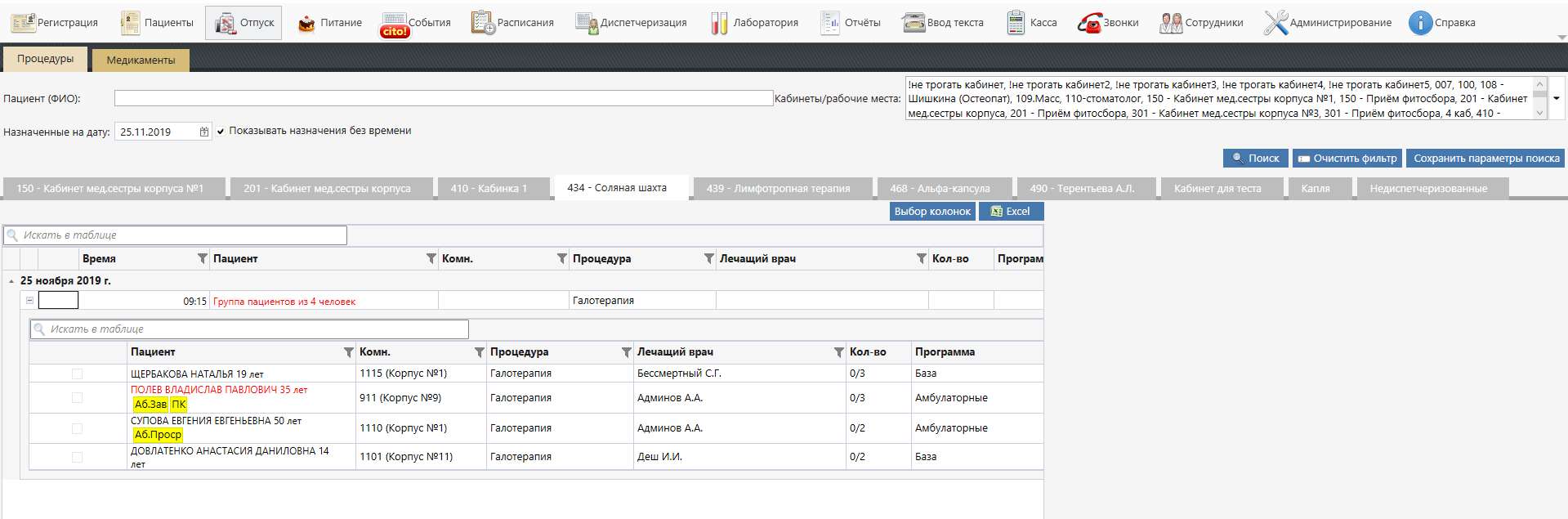1. В данном модуле Процедурная может просмотреть как свое расписание, так и расписания других специалистов и кабинетов.