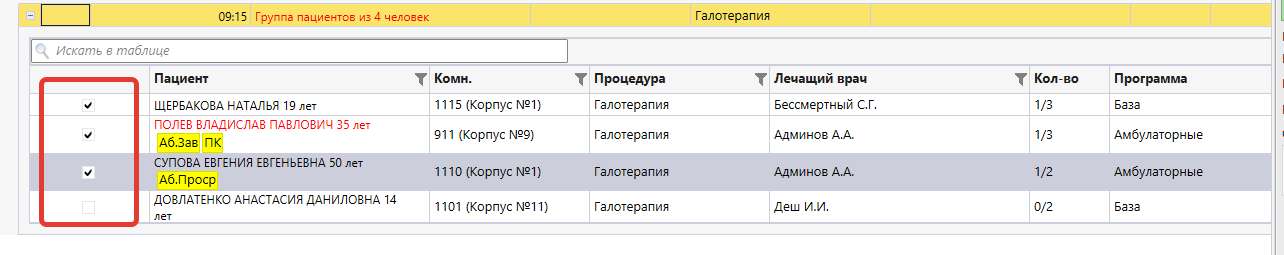 4. В таблице ниже отобразятся назначенные пациенты и информация о процедуре. Для более быстрого поиска можно использовать поле «Искать в таблице».