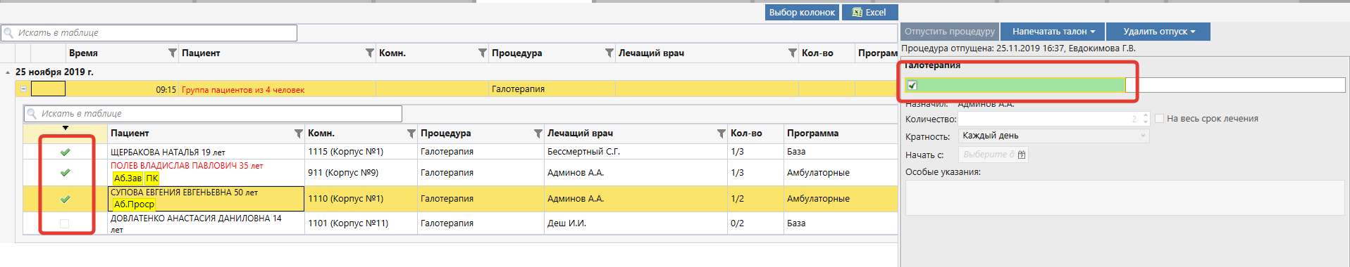 3. Вы можете отметить галочками пациентов, которым хотите произвести отпуск и нажать кнопку "Отпустить процедуру". Одним нажатием Вы отметите отпуски процедуры у всех выделенных пациентов.