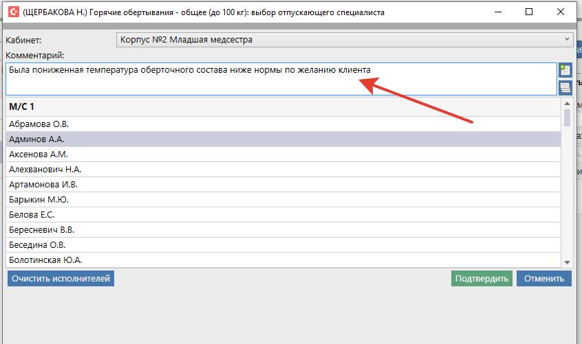 Введенный комментарий при отпуске будет доступен в истории болезни пациента в листе назначений в контекстном меню при наведении на ячейку отпуска процедуры.