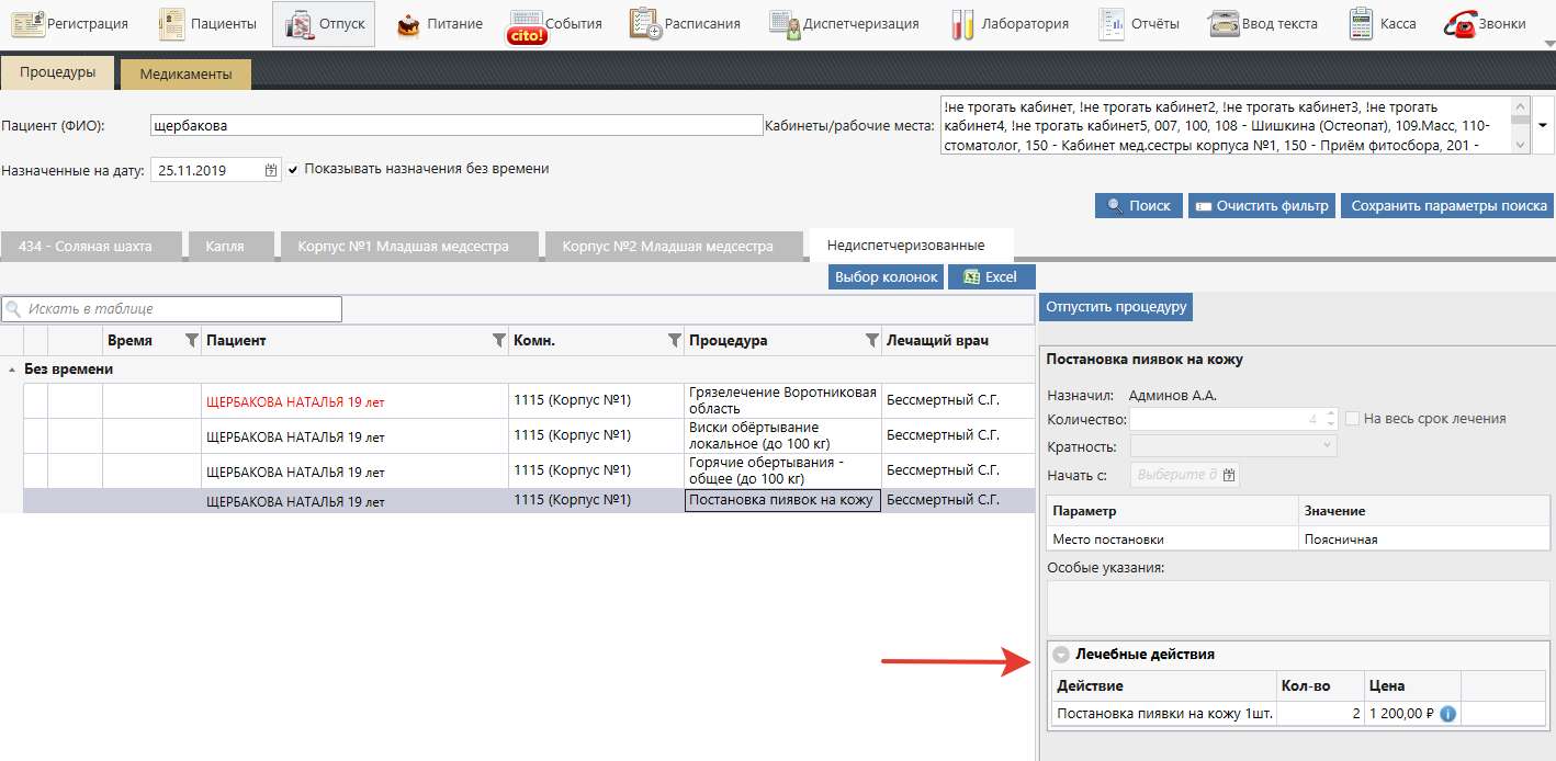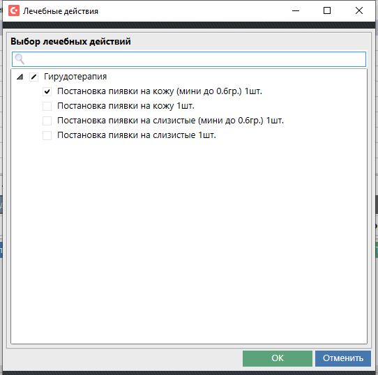 При отпуске услуги набор лечебных действий может быть изменён. В окне отпуска услуги есть возможность указать выполненные Лечебные действия в рамках данной процедуры.