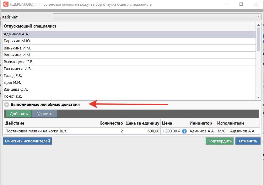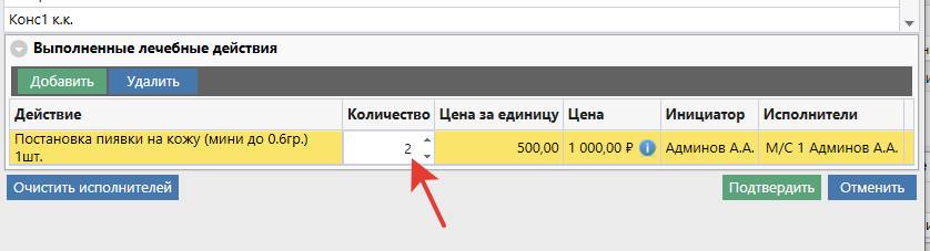 4. Указать количество выполненных лечебных действия в рамках отпуска этой процедуры. Если в настройке Лечебного действия и Лечебной процедуры стоит флаг “Изменяемая цена” – то у сотрудника будет возможность изменить колонку "Цена".