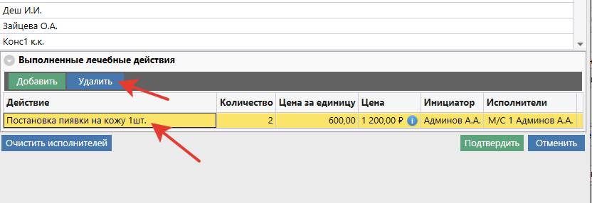 2. Удалить - выделить строку с лечебным действием и нажать кнопку "Удалить";