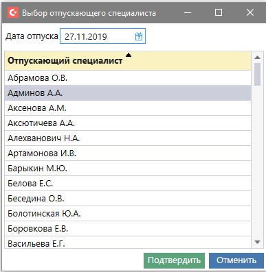 При нажатии на кнопку появляется окно с выбором отпускающего специалиста и указать дату отпуска