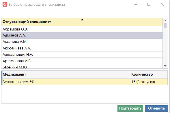 В зависимости от настроек может появиться окно с выбором отпускающего специалиста и медикаментов: