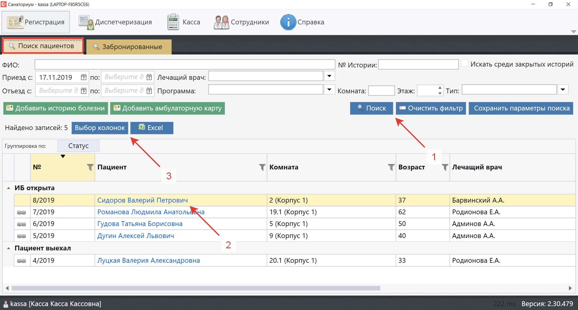 1. В модуле «Регистрация» во вкладке «Поиск пациентов» отображается список проживающих в санатории. В верхней части окна расположены фильтры для поиска проживающих. Например, в поле ФИО можно написать первые буквы фамилии и в списке отобразиться те, у кого фамилии начинаются на эти буквы.