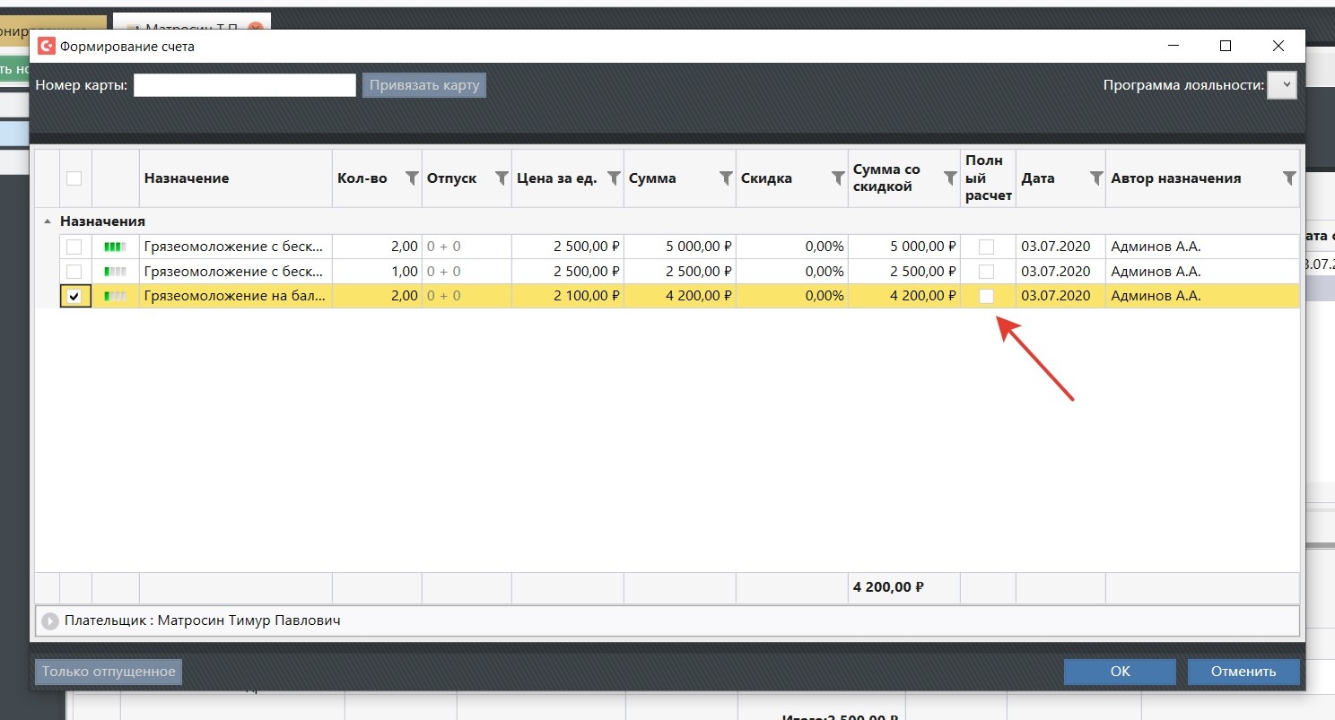4. Если у пациента скидка, то следует ее выбрать в меню «Программа лояльности» (4). Так же можно выставить скидку вручную в колонке «Скидка».