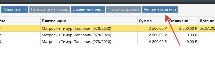 В модуле "Касса" есть возможность быстро найти все счета, за которые нужно напечатать чек зачета аванса. Для этого активируйте флаг "Зачёт авансовых платежей"