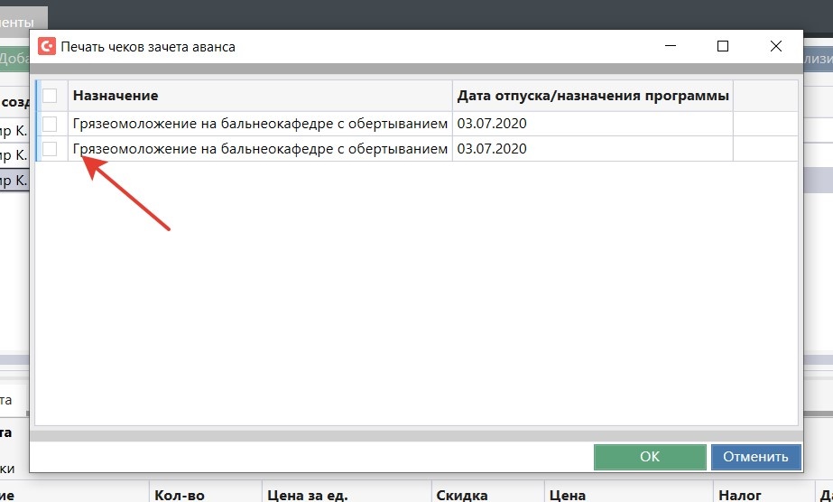 3. Далее, в окне "Печать чеков зачета аванса" выбираются отпущенные процедуры, за которые нужно напечатать чек зачета аванса: