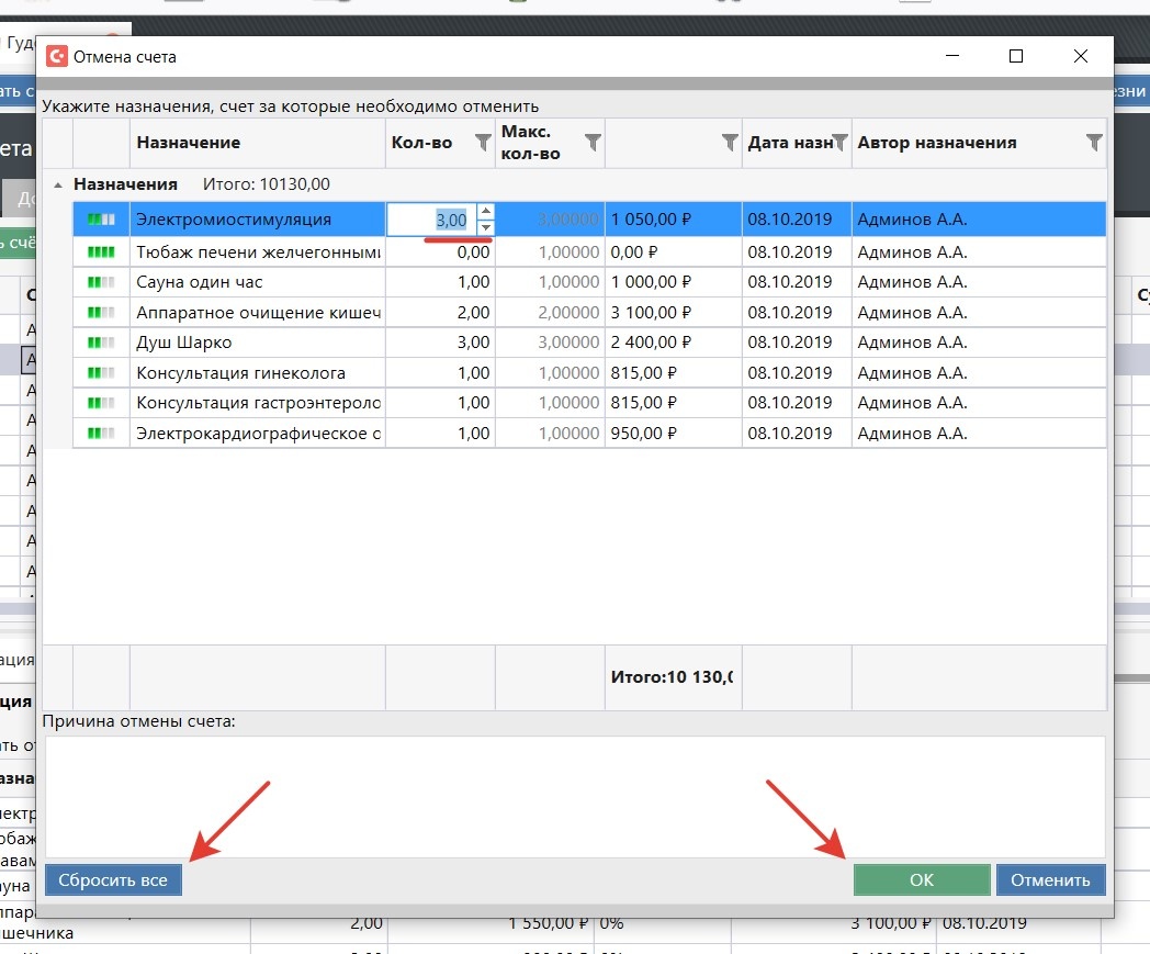 4. Для отмены только некоторых услуг нужно выставить только то количество, которое необходимо отменить. Для удобства есть кнопка «Сбросить все», которая сбрасывает количество услуг на 0.