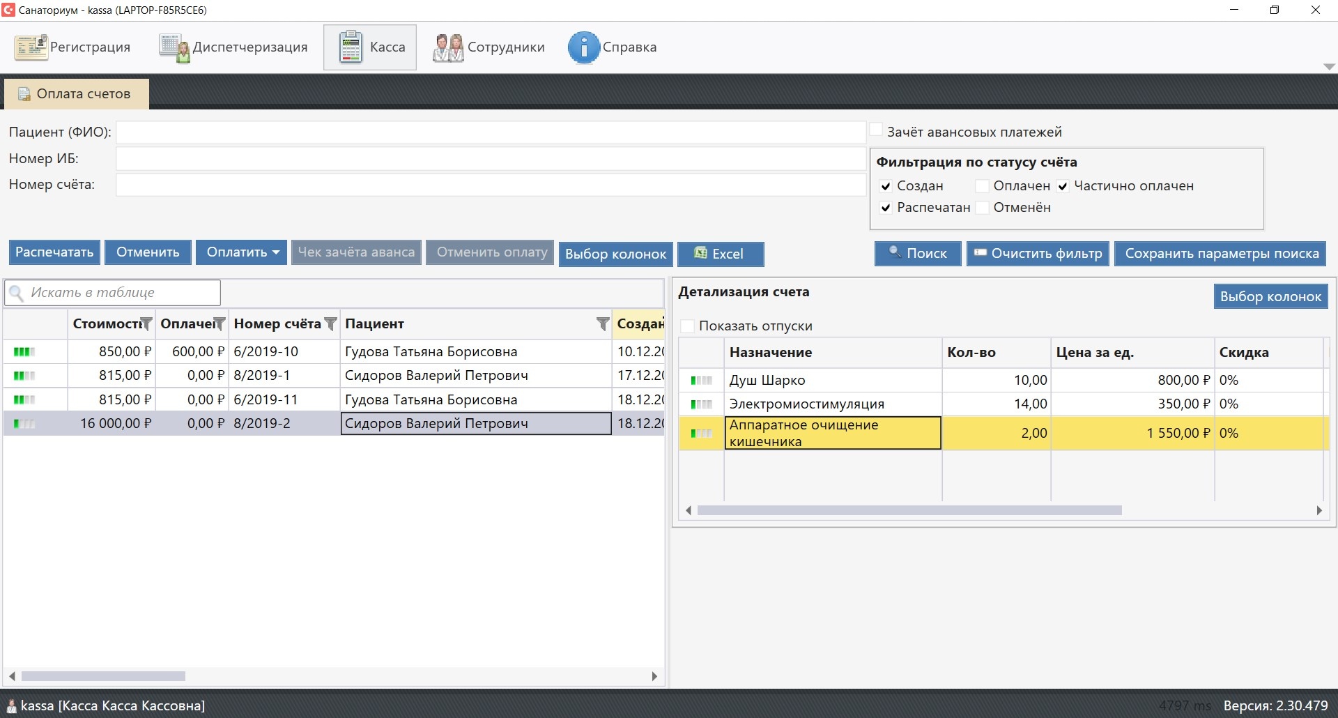 7. После того как счет сформирован (статус счета будет с одной заполненной батарейкой ), можно распечатать договор на оказание медицинских услуг или другой сопроводительный документ, используемый в вашем санатории. Для этого нужно выбрать счет в списке и нажать «Распечатать» (5).