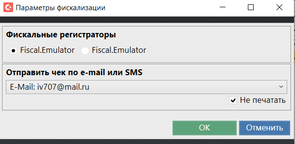 В окне "Параметры фискализации", если к рабочей станции привязано несколько фискальных регистраторов, можно выбрать на какой фискальный регистратор отправлять данные. Также если в ИБ указана почта или контактный телефон, можно не печатать чек, а отправить чек или по e-mail или по sms. Данный функционал позволяет экономить чековую ленту.