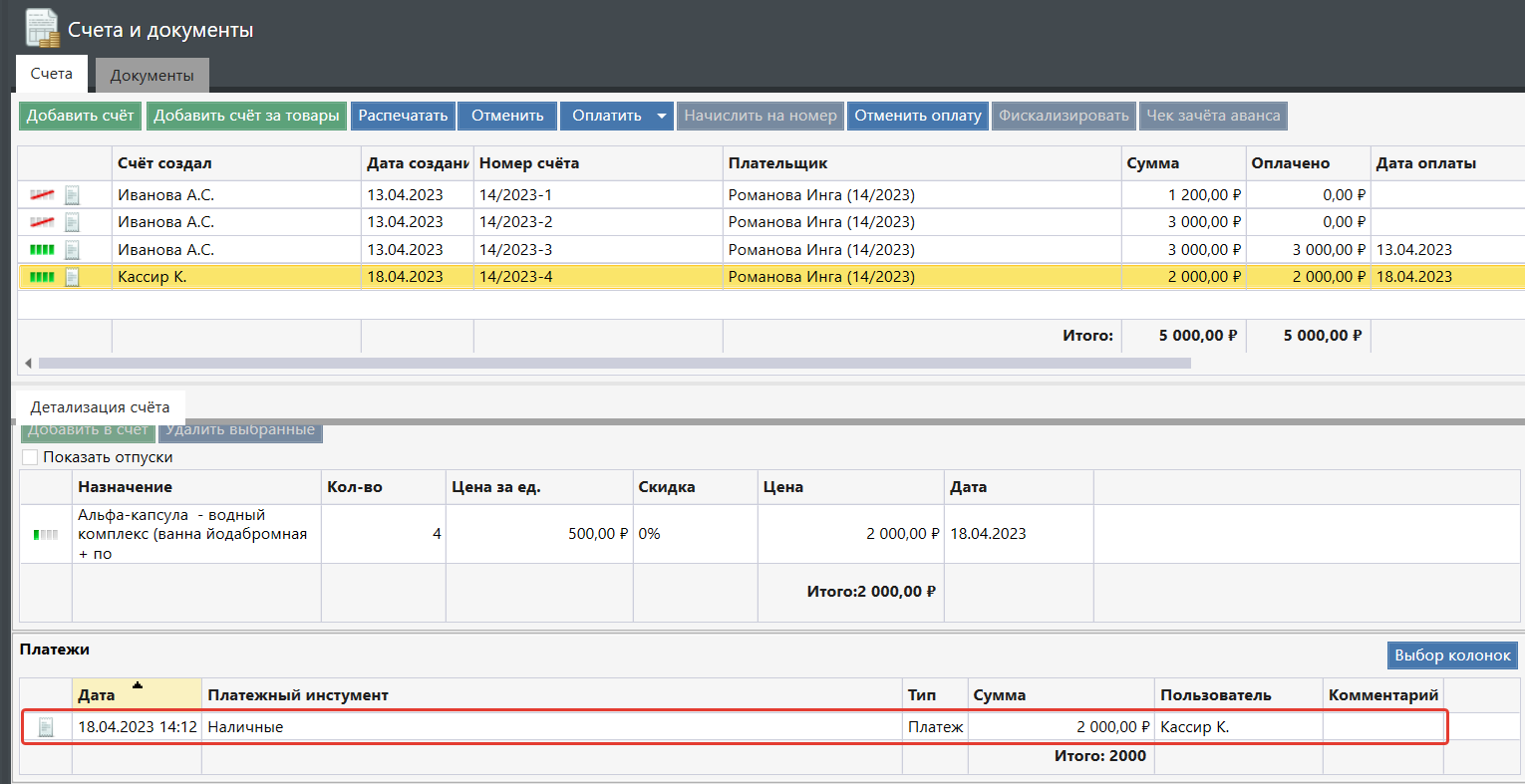 В модуле «Касса» вы можете по аналогии со секцией «Счета и документы» модуля «Регистрация» оплачивать уже выставленные счета, а также осуществлять продажу товаров.