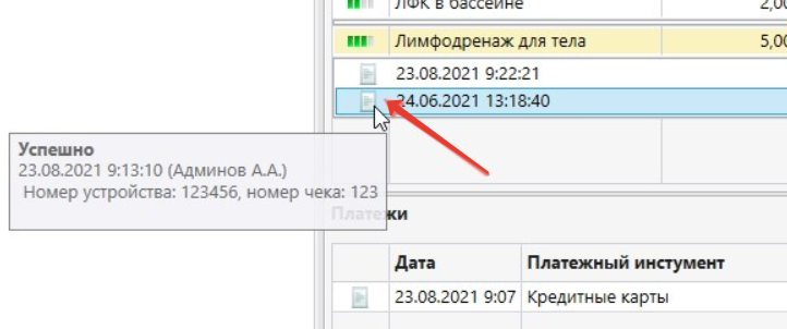 9. После оплаты в разделе "Платежи" появляется транзакция оплаты, иконка  говорит о том, что транзакция фискализирована.