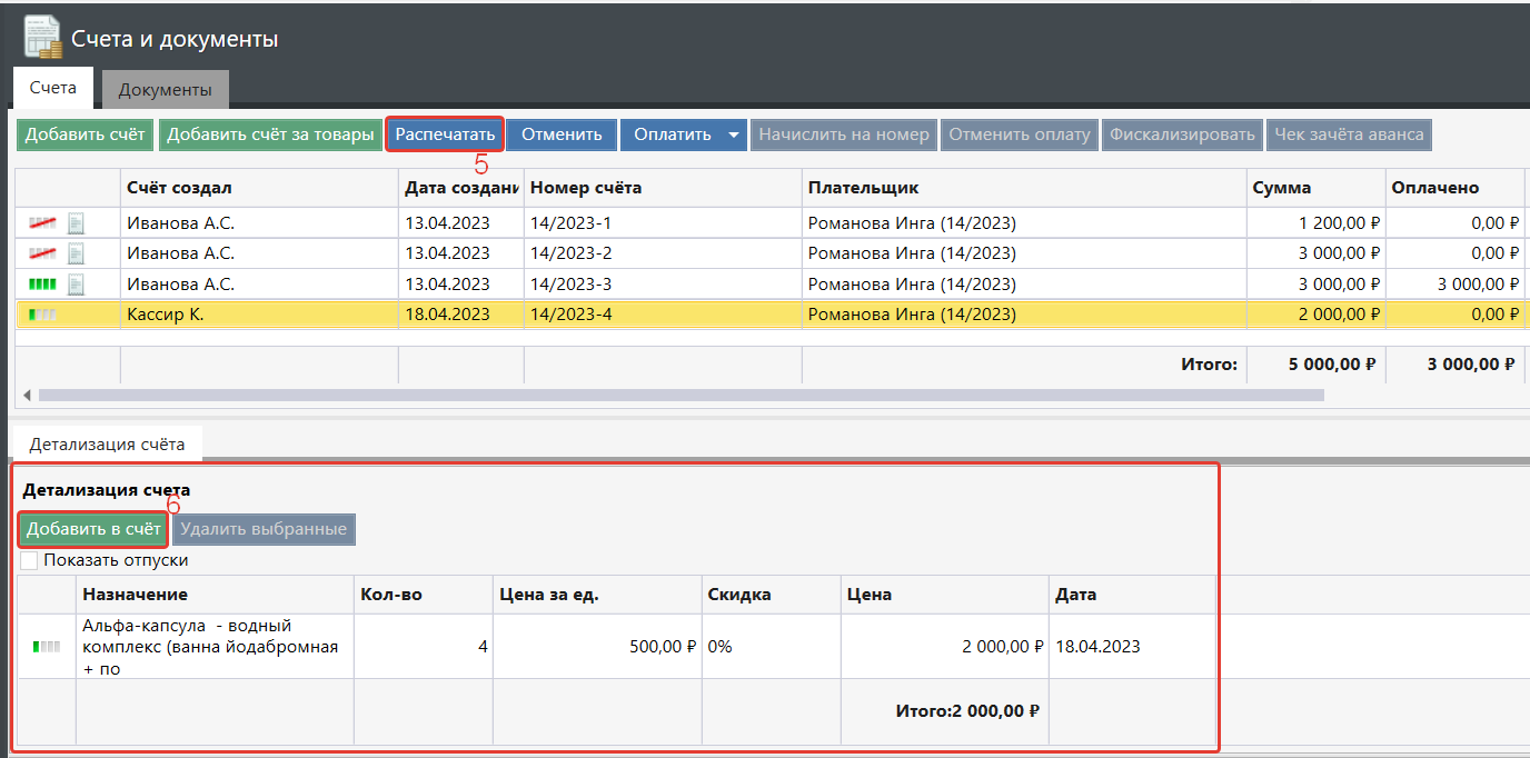 После печати статус счета станет .  Есть возможность редактировать созданный счет: кнопки "Добавить в счет" (6) и "Удалить выбранные" будут доступны только пользователю, который этот счет создал и только первые 15 минут после создания.