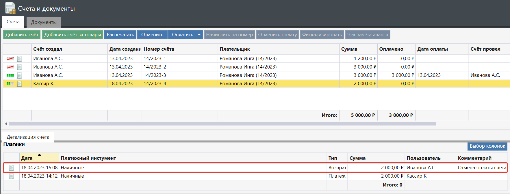 В случае отмены оплаты, счёт переходит снова в статус "Распечатан". При этом транзакция возврата также фискализируется, добавляется признак
