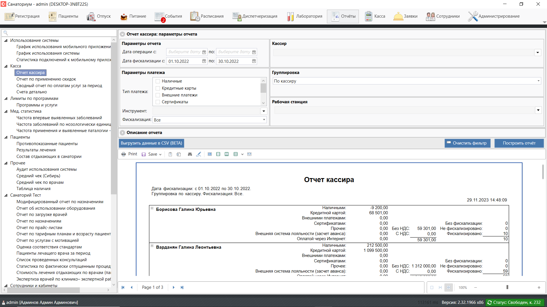 Отчет предназначен для сегментации клиентов по сумме дохода, который они принесли санаторию за выбранный период. Позволяет выделить наиболее значимых клиентов и сегментировать клиентскую базу по размеру чека и частоте визитов.
