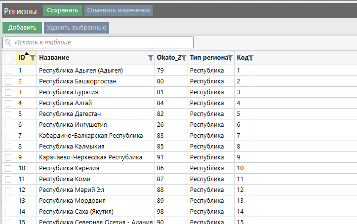 Справочник «Регионы»